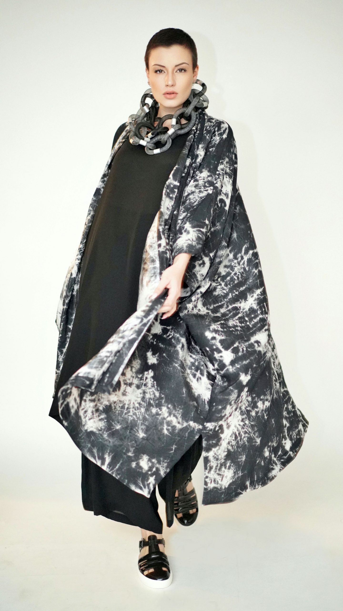Modell/Grösse: One Size, weit geschnitten, 80 bis 105 cm lang, mit Steh- oder Schalkragen