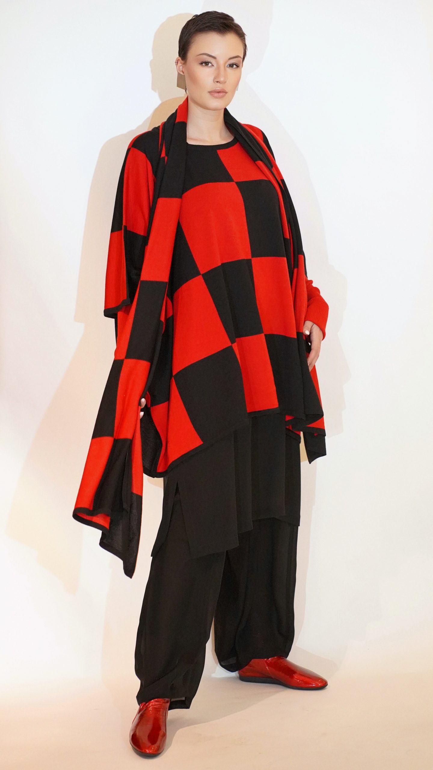 Modell: Pullover Karo ohne Ärmel; Rundhals, One Size, ca. 80 bis 90 cm lang, 110 bis 120 cm breit
